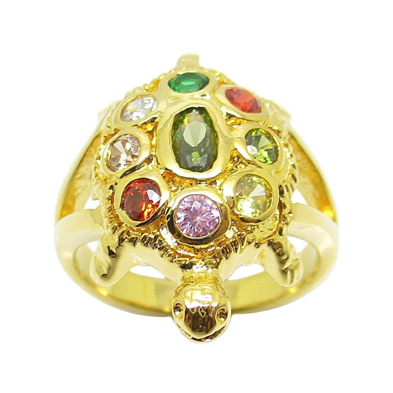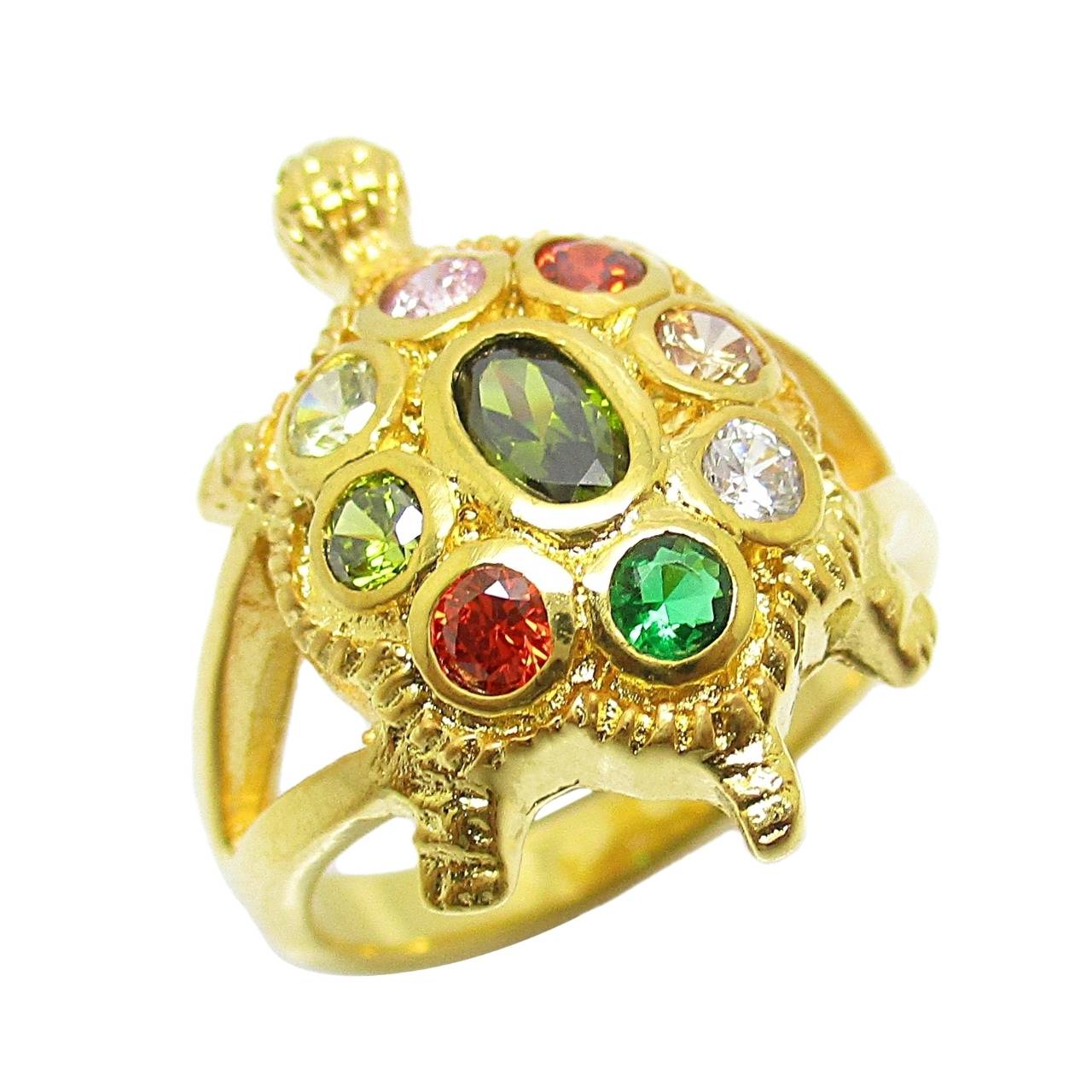 แหวนทรงเต่าที่ดีไซน์ลวดลายแผ่นหลังเต่าอย่างมีมิติ โดยใช้พลอยสีสดหลายเม็ดฝังแน่นเต็มพื้นที่ ตัวเรือนทองล้อมเส้นอย่างสมมาตรให้ลวดลายดูเด่นขึ้น