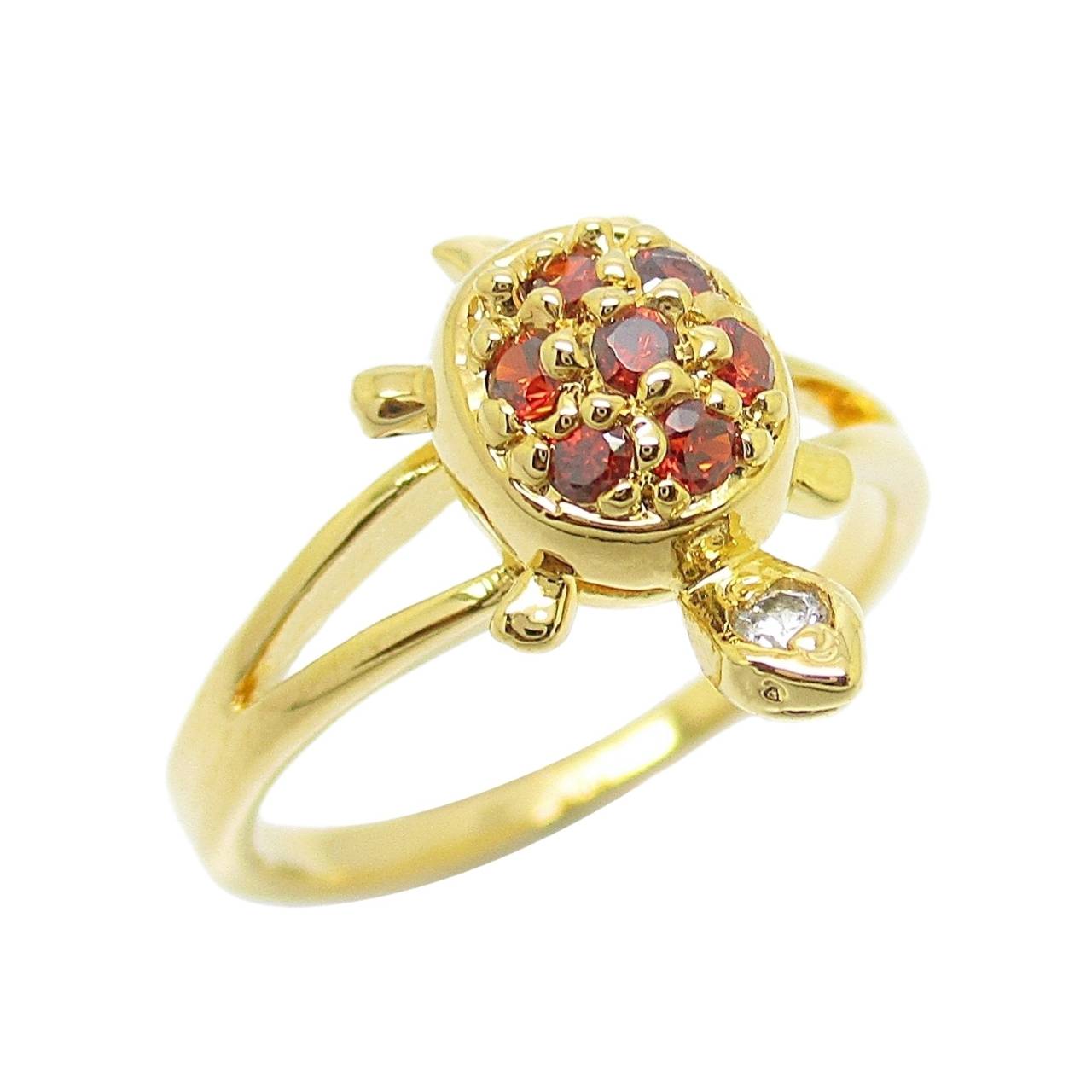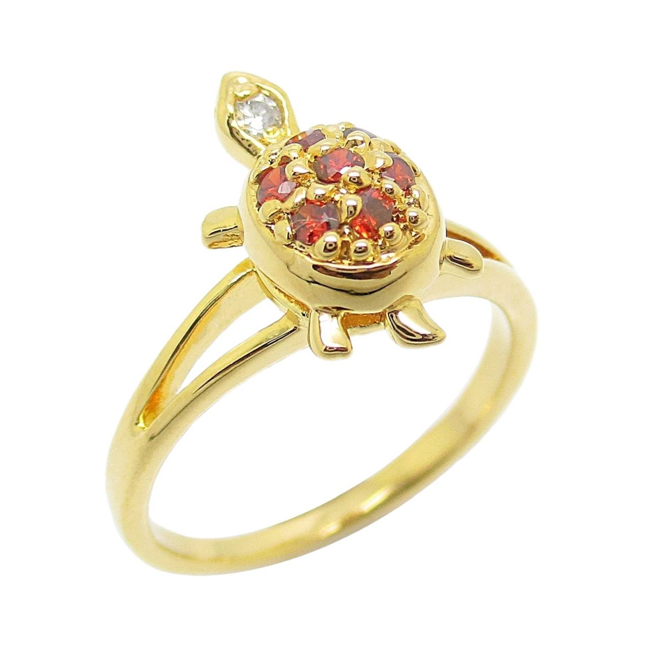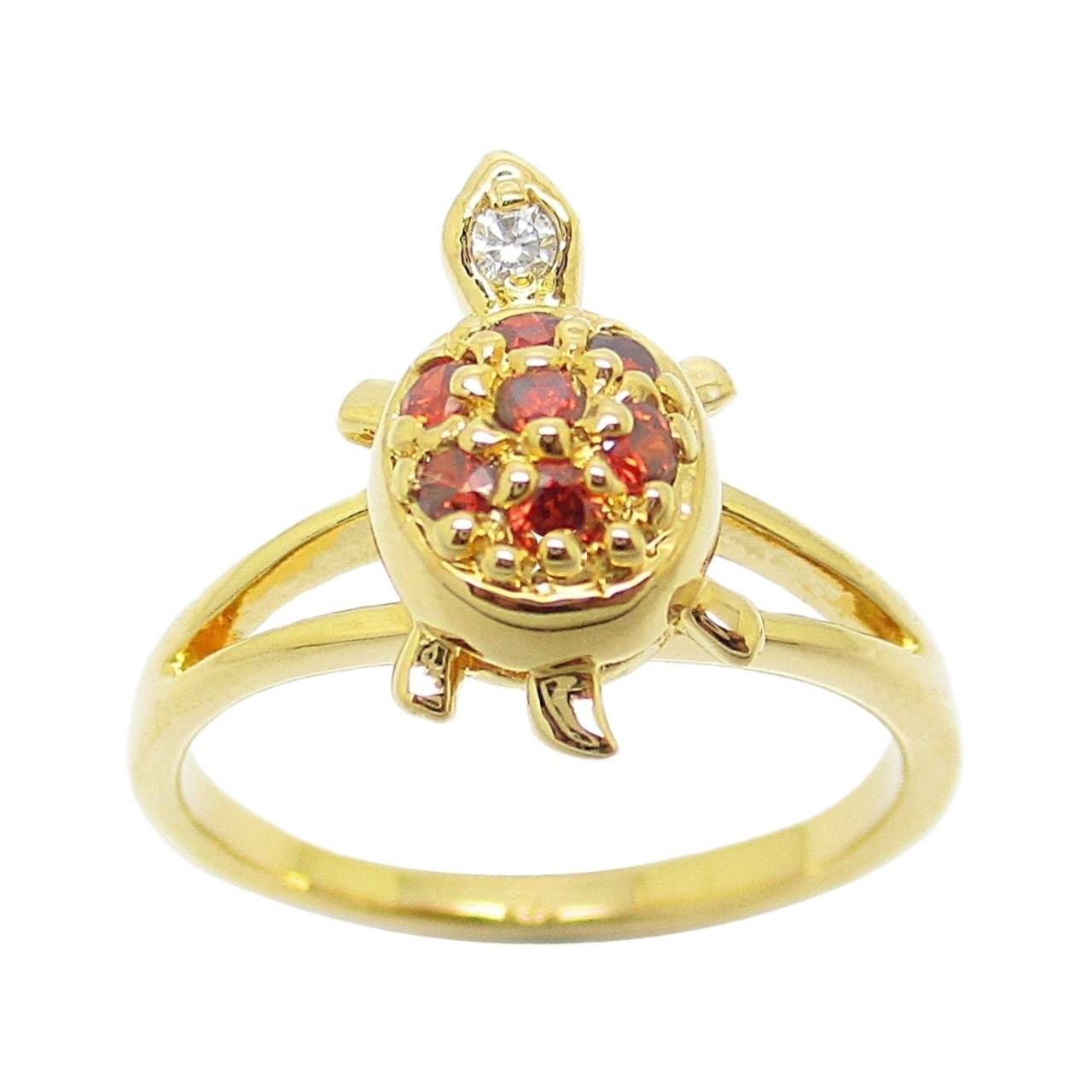 แหวนทรงเต่าที่ดีไซน์ลวดลายแผ่นหลังเต่าอย่างมีมิติ โดยใช้พลอยสีสดหลายเม็ดฝังแน่นเต็มพื้นที่ ตัวเรือนทองล้อมเส้นอย่างสมมาตรให้ลวดลายดูเด่นขึ้น
